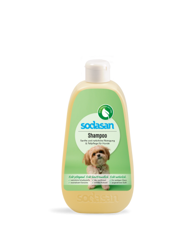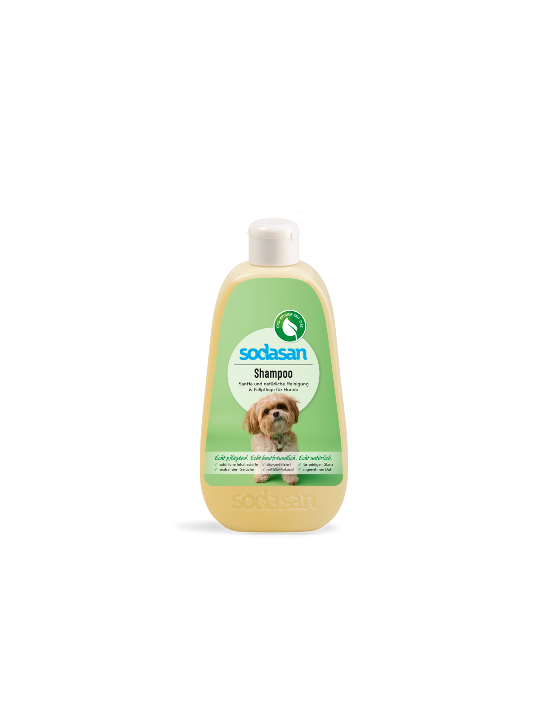 DESCRIERE Acest sampon de inalta calitate si certificat ecologic este special conceput pentru caini. In calitatea obisnuita de firma Sodasan, fara parfumuri sintetice, coloranti si conservanti, acest sampon garanteaza cel mai inalt nivel de curatare si ingrijire blanda. Potrivita cu valoarea naturala a pH-ului pielii, combinatia de agen?i tensioactivi naturali si ulei de nuca de cocos organic asigura o pieptanare usoara si un strat catifelat, moale si stralucitor. Un absorbant natural de mirosuri ce neutralizeaza usor mirosurile neplacute. Mirosul subtil ?i de lunga durata se datoreaza esentelor naturale din ulei de bergamota, eucalipt si patciuli. Produsul este certificat conform ghidurilor NCP si PETA inregistrate. Mai multe informatii despre certificari pute?i gasi aici: Continut cu 100% ingrediente de origine naturala. Biodegradabil. Fara coloranti sintetici, conservanti si parfumuri. Fara enzime si fara microplastice. Ambalaj organic, sticla si capacul din plastic vechi. Reciclabil. Re�ncarcabil. Compozitie: >30% apa, 5-15% zahar (surfactant neionic), derivati ??de alchil poliglucozid (surfactant anionic),