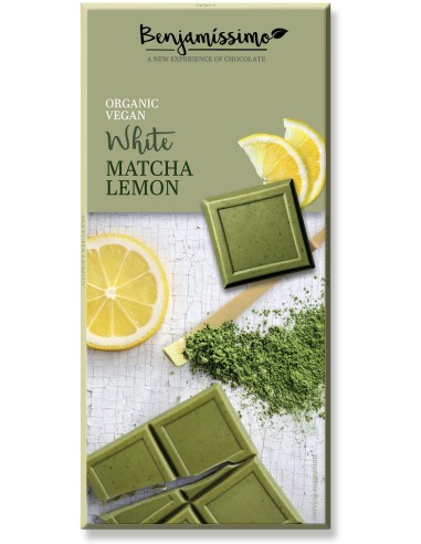 Ciocolata alba cu matcha si lamaie bio, 70g, Benjamissimo