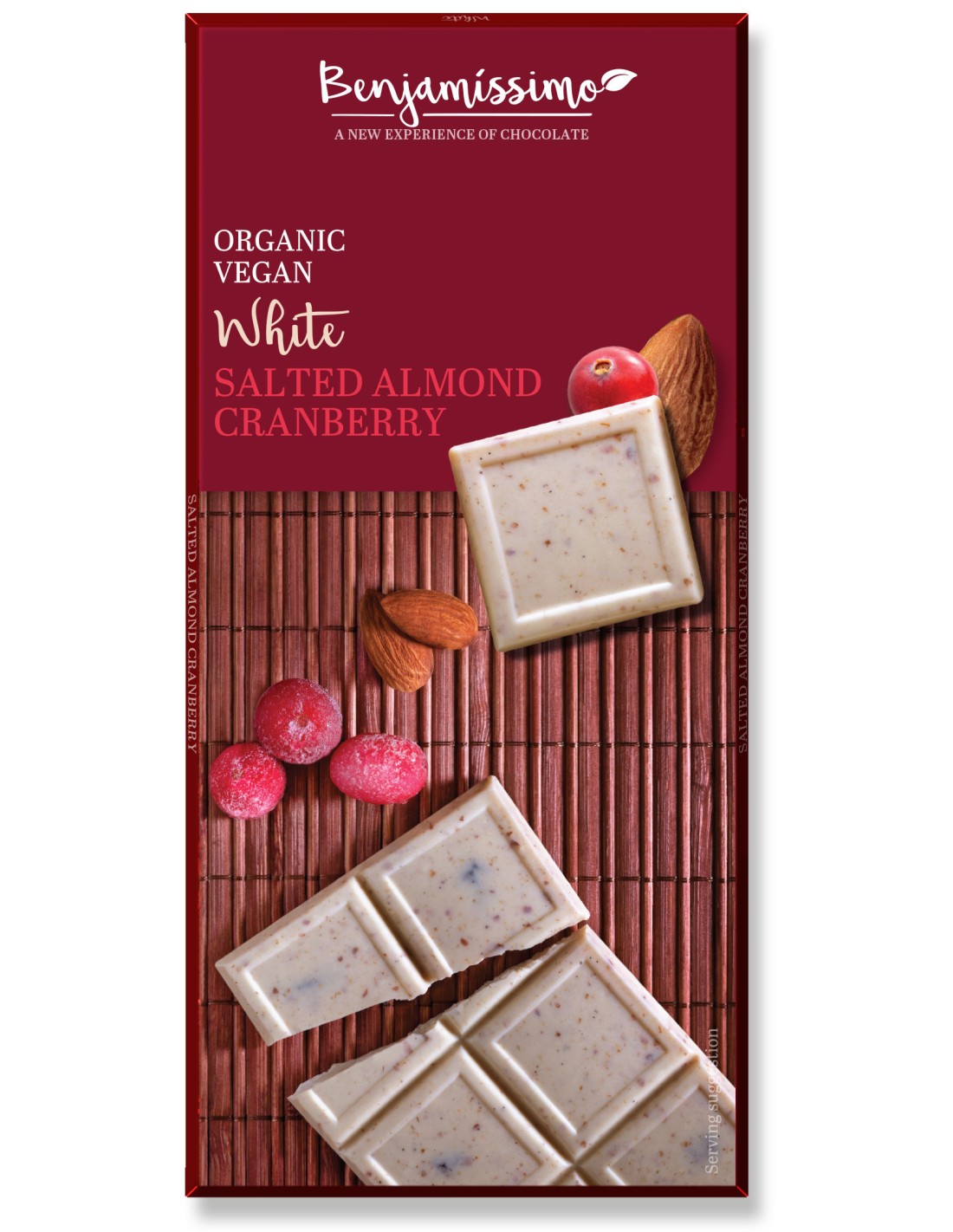 Ciocolata alba cu migdale sarate si merisor bio, 70g, Benjamissimo