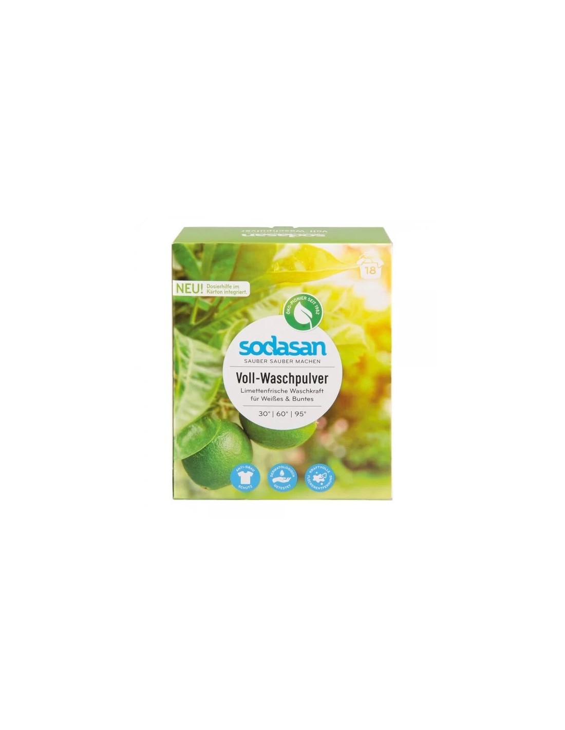 Detergentul praf universal cu lime Sodasan spala rufele albe si colorate. Potrivit pentru spalare de la 30° la 95° C. Formula inovatoare cu ingrediente din plante indeparteaza chiar si petele incapatanate din fibre si protejeaza rufele sa nu devina gri. Aromele naturale confera rufelor prospetimea placuta a teiului si a verbenei. Compatibilitatea foarte buna cu pielea este confirmata dermatologic.