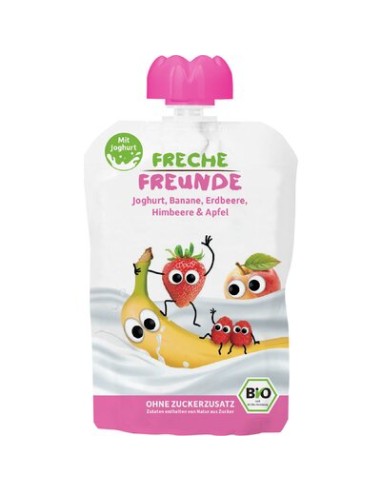 Ingrediente: IAURT (39%), piure de banane*, piure de capsuni* (23%), pire de zmeura* (3%), pire de mere*, gris din orez*, ulei de rapita*. Nimic altceva.